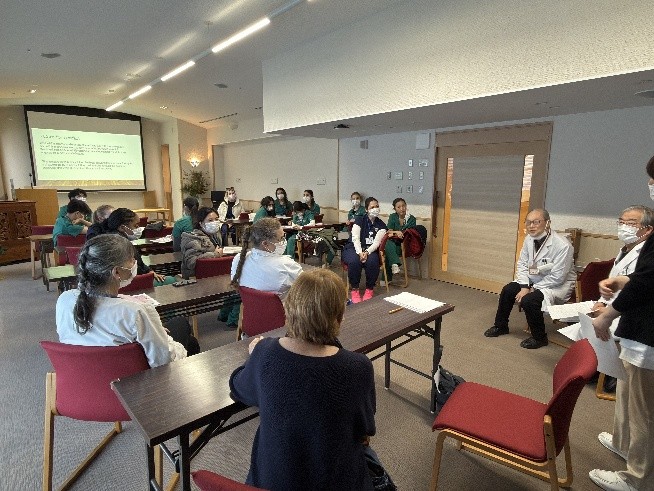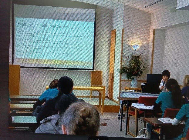 アメリカでは在宅死が50%だそうで、最期まで過ごすことも可能になっている日本のホスピスケアの話や病棟見学はとても新鮮に映ったようでした。学生さんや先生とお話しする中で、普段行っている私たちのケア(日常生活や症状緩和をする中で心を開いてもらう)の在り方は実は日本文化からきているのかもしれないと気付かされました。とても楽しい国際交流でした。